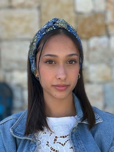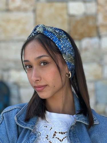 Mini Sequins Headband - Blue Sequin Fabric with Green and Light Blue Spots Pattern