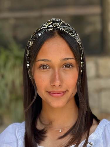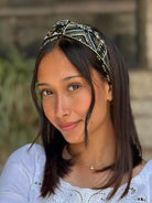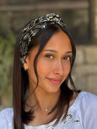 Mini Sequins Headband-black with grey-gold embroidery and subtle gold sequins on soft chiffon