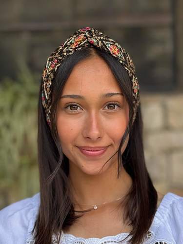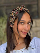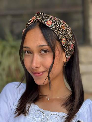 Mini Sequins Headband-black base with gold diamond pattern, colorful floral embroidery, and delicate sequins.