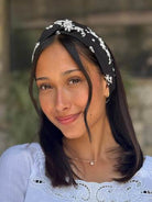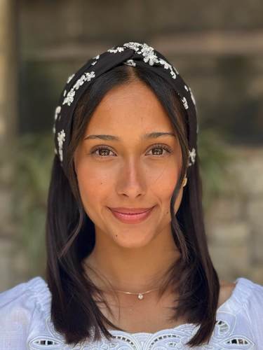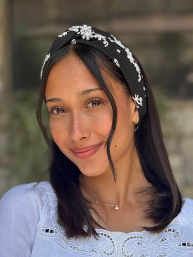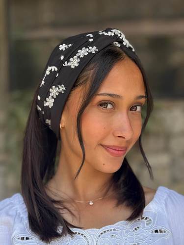Mini Sequins Headbandb-black with delicate off-white floral embroidery.