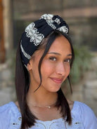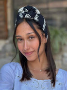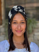 Shir Headband -black hair wrap with off-white embroidery cotton fabric