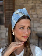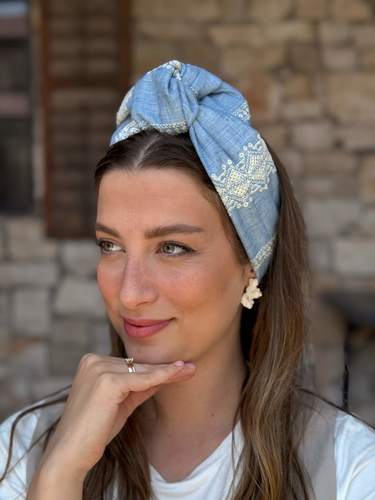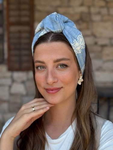 Shir Headband -light blue with off-white embroidery – cotton hair wrap
