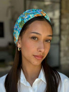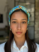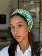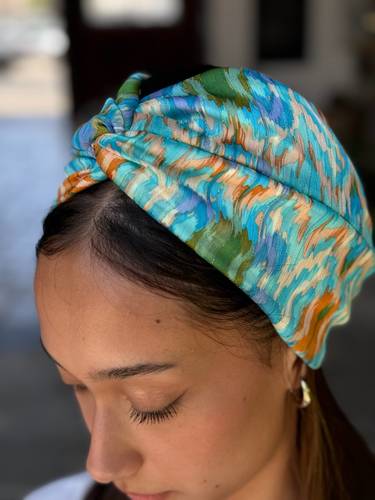 Mini Noy Headband- light blue base and colorful gold stripes chiffon fabric