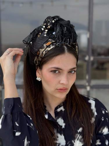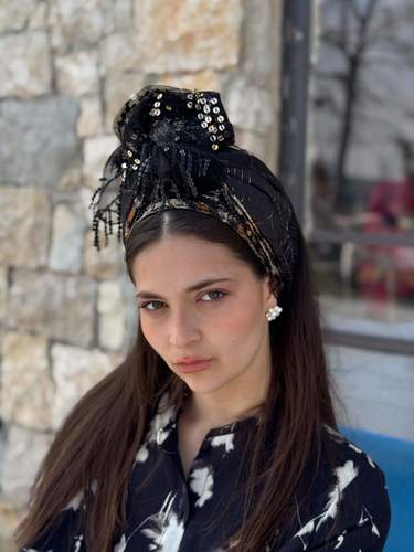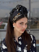 The "Ziv Headscarf" is a beautifully designed accessory made from four different fabrics chiffon, brocade, sequins, and sparkles.