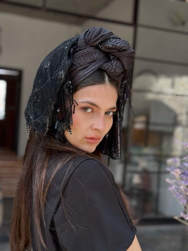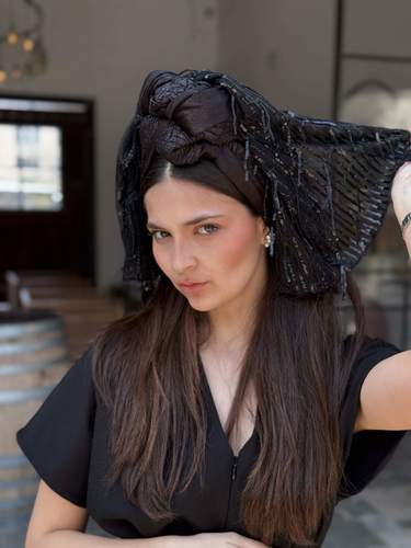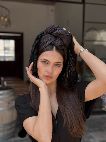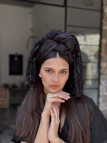 The "Ziv Headscarf" is a beautifully designed accessory made from four different fabrics chiffon, brocade, sequins, and sparkles.