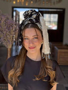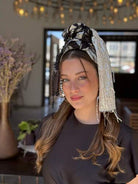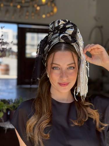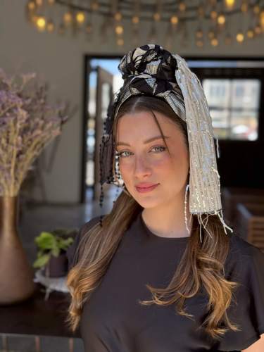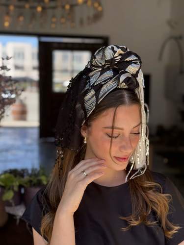 Ziv Headscarf-Black and beige with silver shapes and elegant sequins